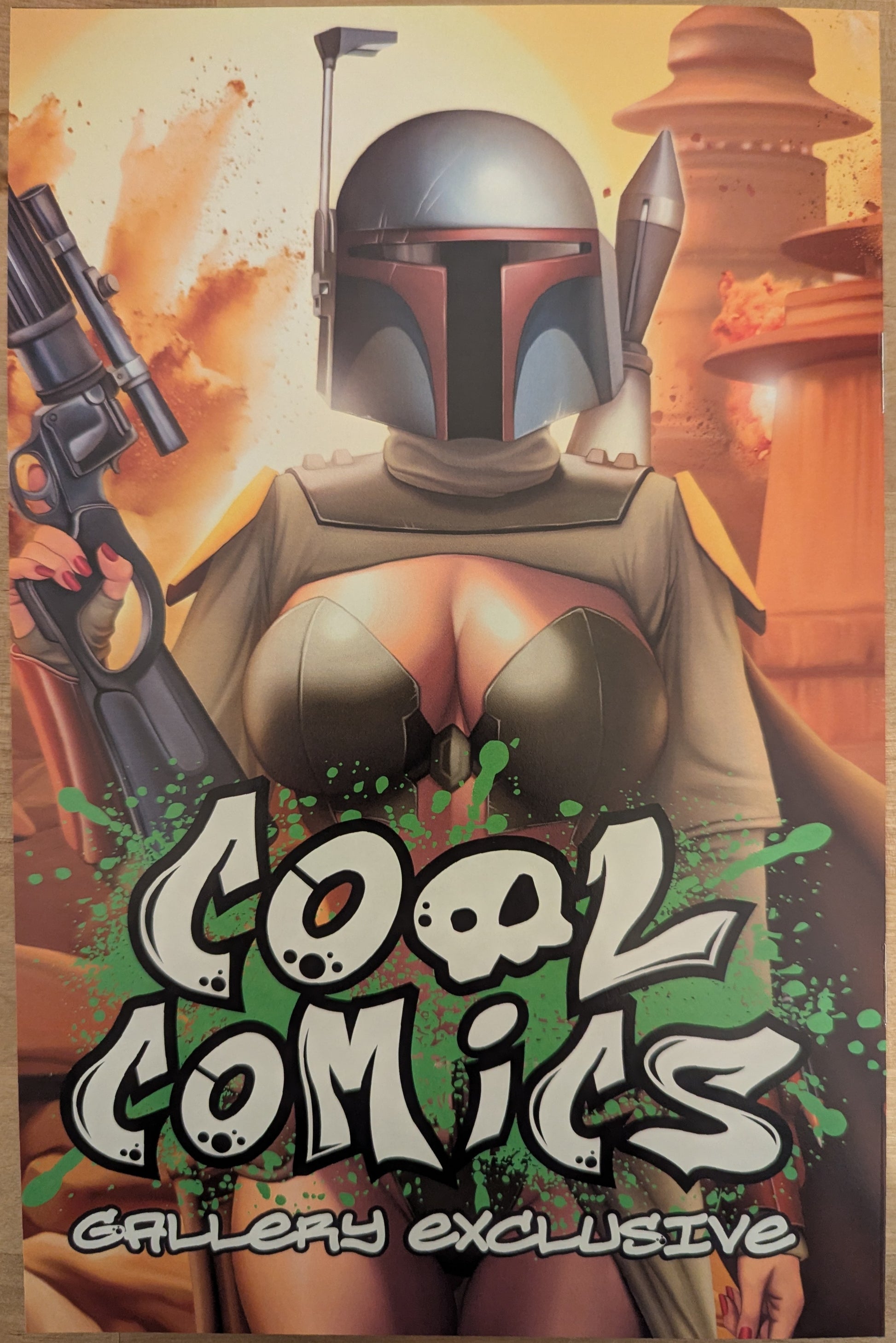 Fire blooms across the dunes as a helmeted Mandalorian strides forward, cape snapping and visor blazing in the twin suns. Skimpy beskar-styled armor, loaded utility belt, and primed wrist gauntlets frame a lethal silhouette while the heavy blaster rides easy in her grip. Equal parts bounty and temptation, this homage turns the Way into pure, high-heat allure.