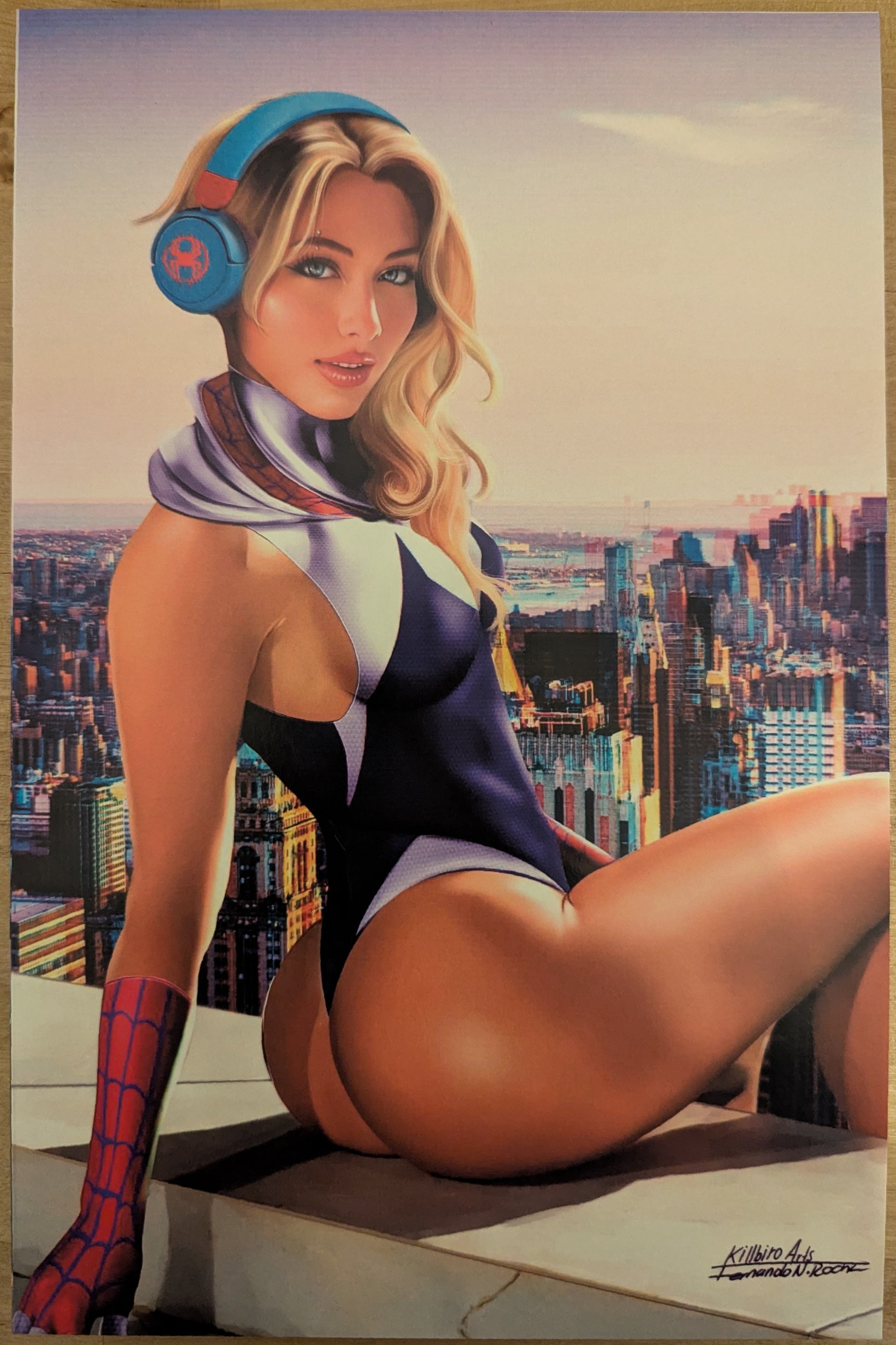 Perched on a high-rise ledge, a blonde bombshell soaks in the skyline while the city’s beat hums through her spider-logo headphones. A sleek white-and-violet suit, hooded cowl, and web-pattern gloves nod to a certain spider sweetheart with a flirtatious twist. Sun-kissed curves and a come-hither glance turn the rooftop into a runway of temptation.