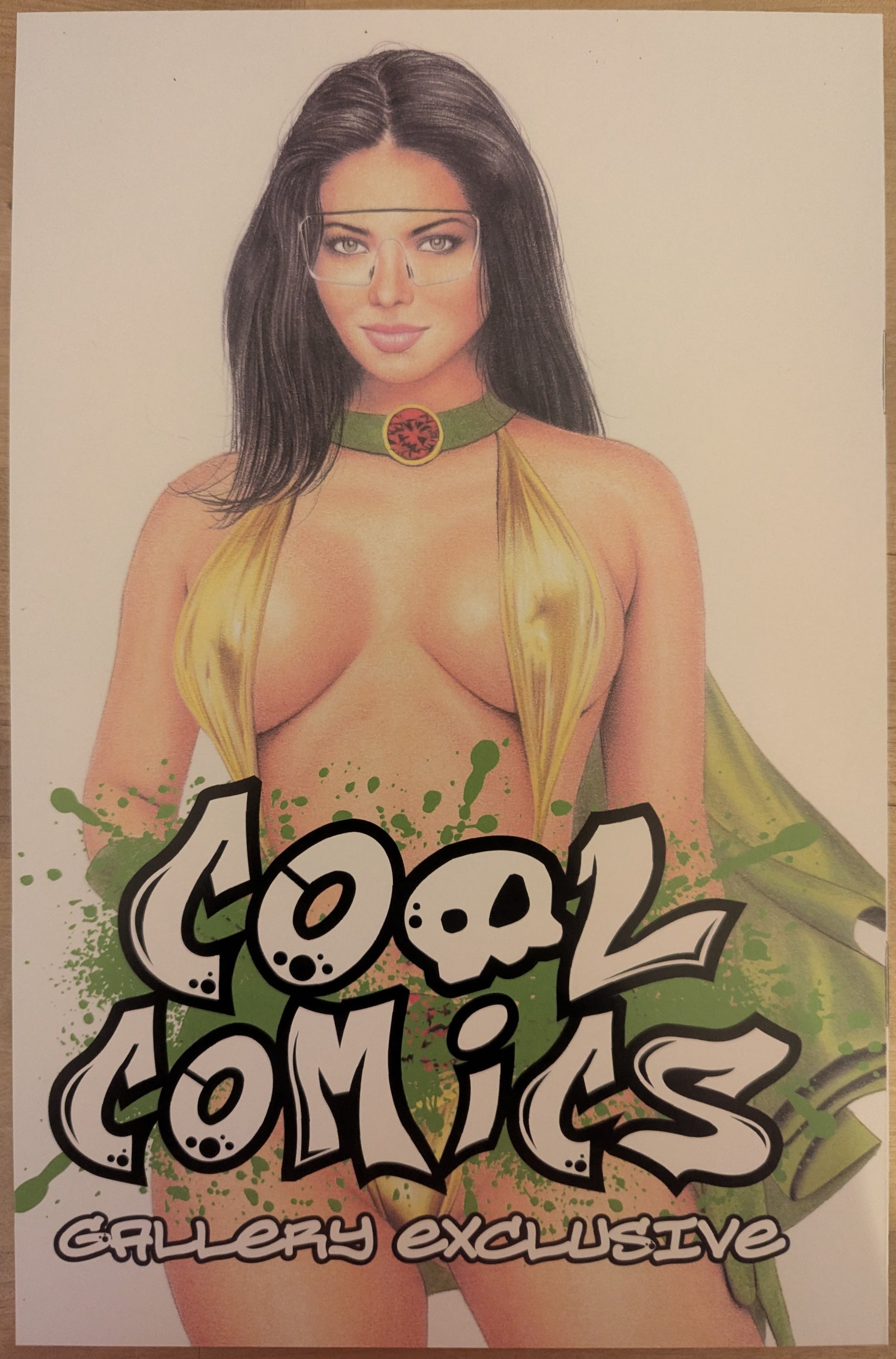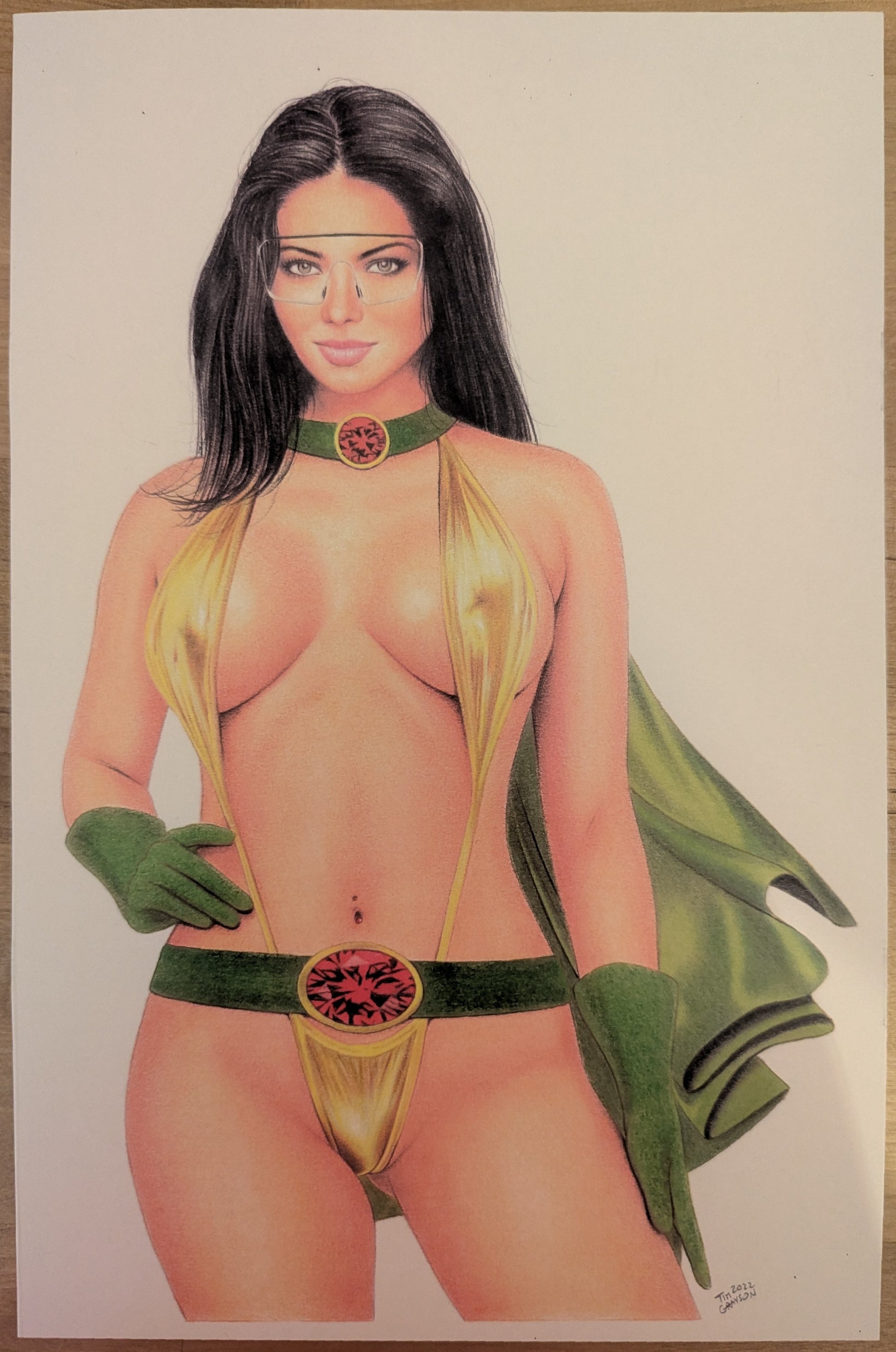 Backlit like a pulp-noir poster, a caped vixen strides forward in a daring yellow slingshot and emerald gloves, visor catching the light as if daring you to look longer. Satin highlights trace her hourglass and the bold red medallion at her waist, while the cape snaps behind her like a velvet whisper. Golden skin, vintage pin-up curves, and that sly half-smile turn classic heroics into a decadent, retro-flavored seduction.