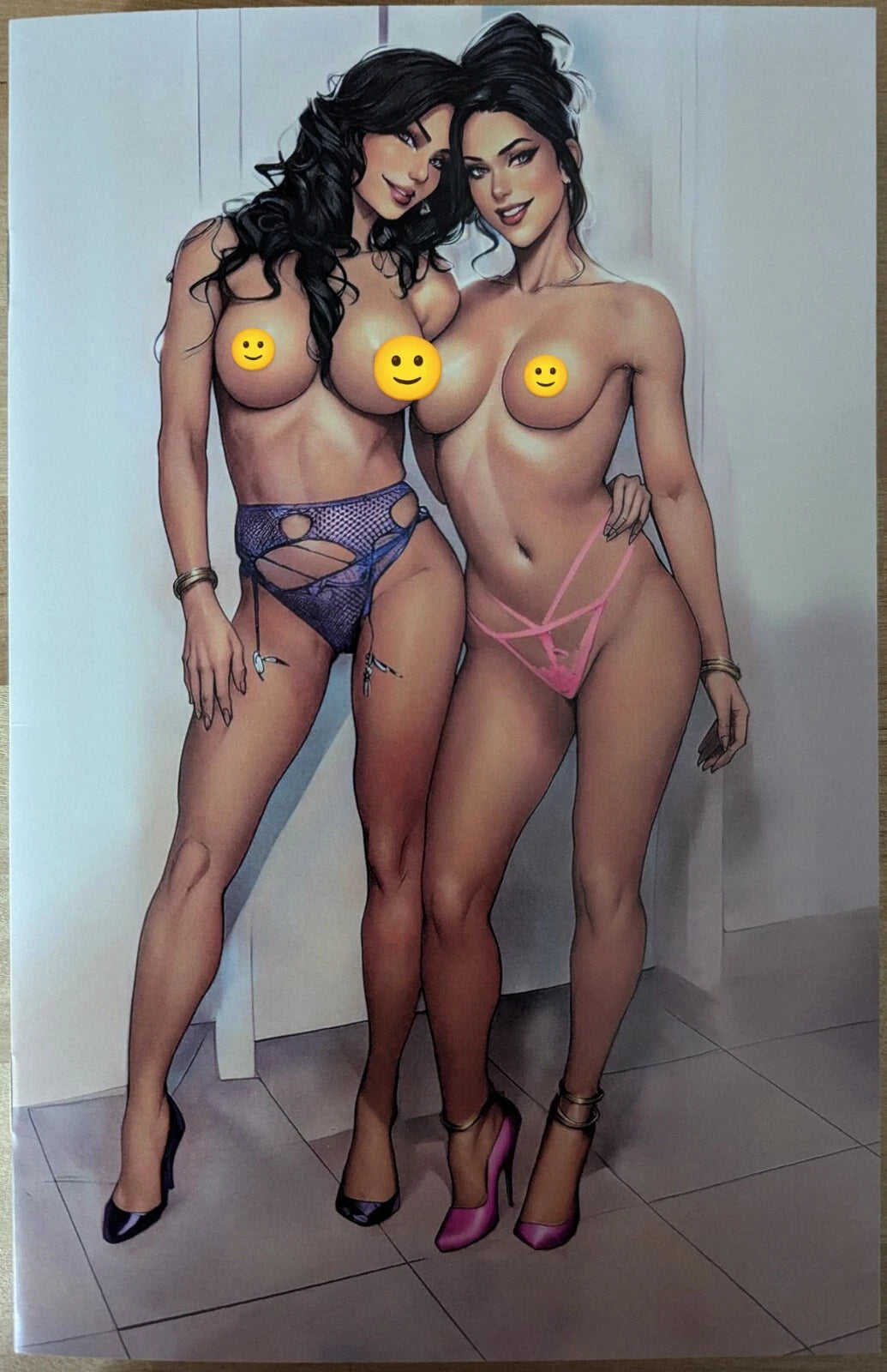 Linked arm-in-arm at the dorm doorway, two mischievous sorority sirens pose hip-to-hip with knowing smiles after a night of house rules broken. Strappy pastel lingerie and matching bracelets and heels frame sun-kissed curves, turning the hallway into their private runway. Their close embrace teases a secret pact of late-night dares, whispered gossip, and double trouble.