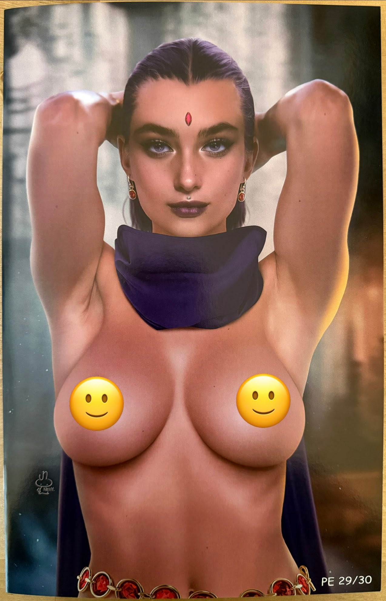 Draped in violet, she lifts her arms and lets midnight silk frame a body forged of shadows and allure. The ruby at her brow smolders as her calm, knowing gaze casts a spell that pulls you closer. Power curls around her like velvet smoke—every curve a temptation, every heartbeat an invocation.