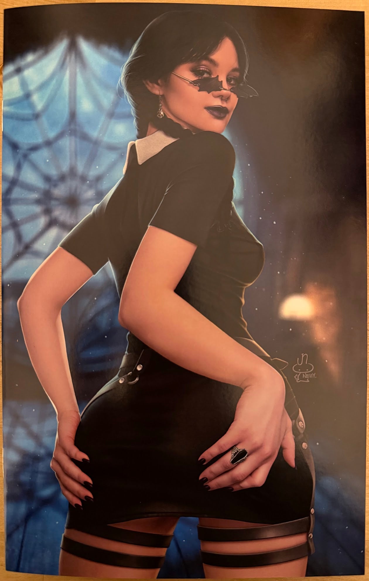 In the dim glow of a haunted midnight, Wednesday Addams turns her back to you, her pale skin luminous against black leather straps that bite teasingly into her curves. She glances over one bare shoulder with those cold, predatory eyes hidden behind bat-wing shades, a faint smirk promising that any hand daring enough to trace the garter at her thigh will be claimed by something far darker than desire. One slow squeeze of her own flawless ass is all the invitation you’ll ever get; accept it, and the Nevermore Academy’s most dangerous girl will drag you willingly into her deliciously wicked shadows.