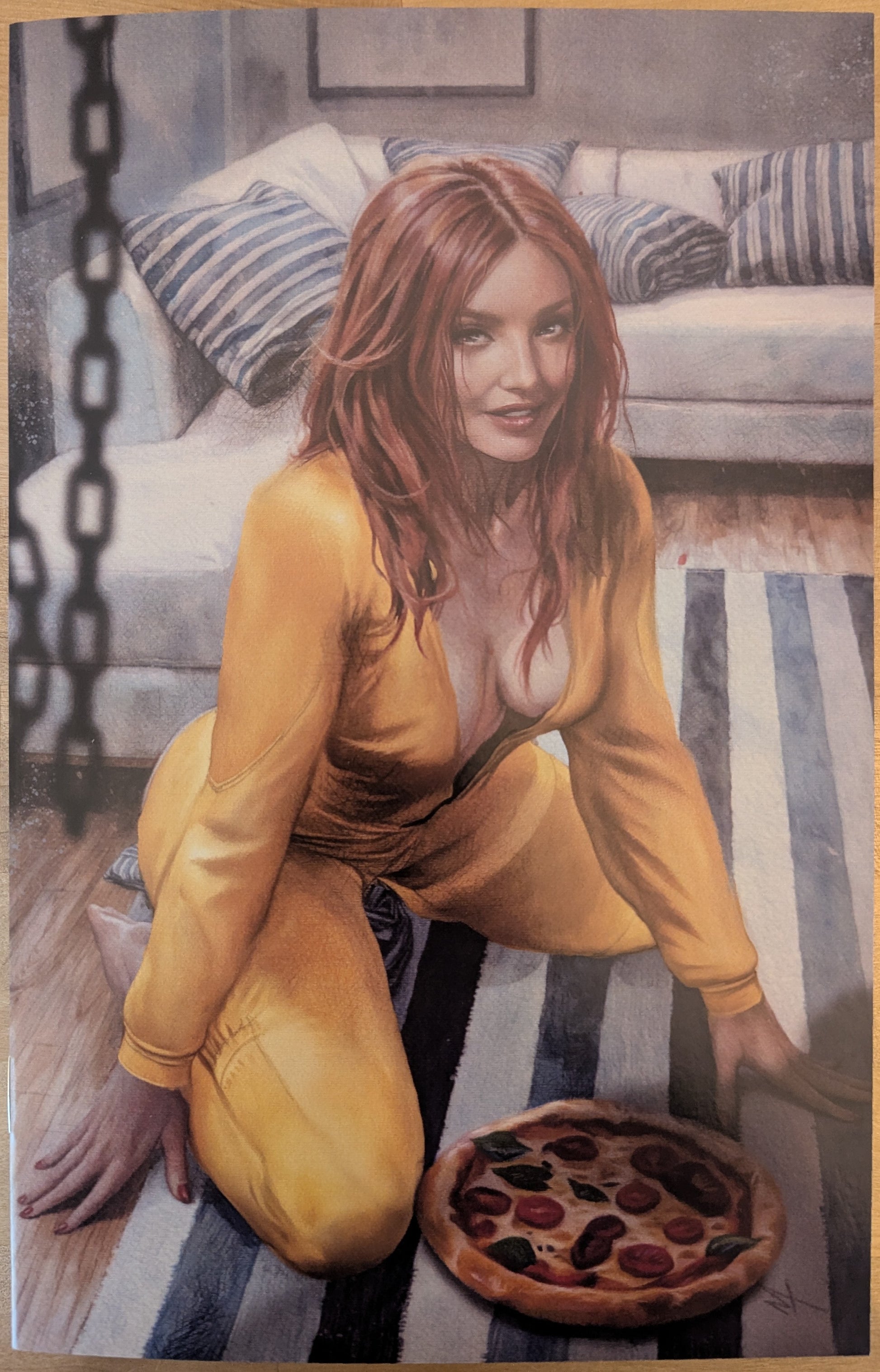 Kneeling seductively on a striped rug, a fiery redhead in a skin-tight yellow jumpsuit leans forward, her deep neckline leaving little to the imagination. The intimate setting and her smoldering gaze promise far more than just the fresh, hot pizza within reach. Every curve, every glance invites a night of unapologetic indulgence and temptation.