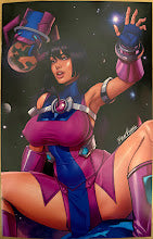 Starlight ripples over her curves as she floats above the cosmos, every motion radiating danger and temptation. Magenta-and-indigo armor hugs close while jeweled tech hums at her hips, promising power with a wicked smile. With a spark at her fingertips and worlds in the backdrop, she rules the night sky like a siren of the stars—look too long, and you’re caught in her orbit.