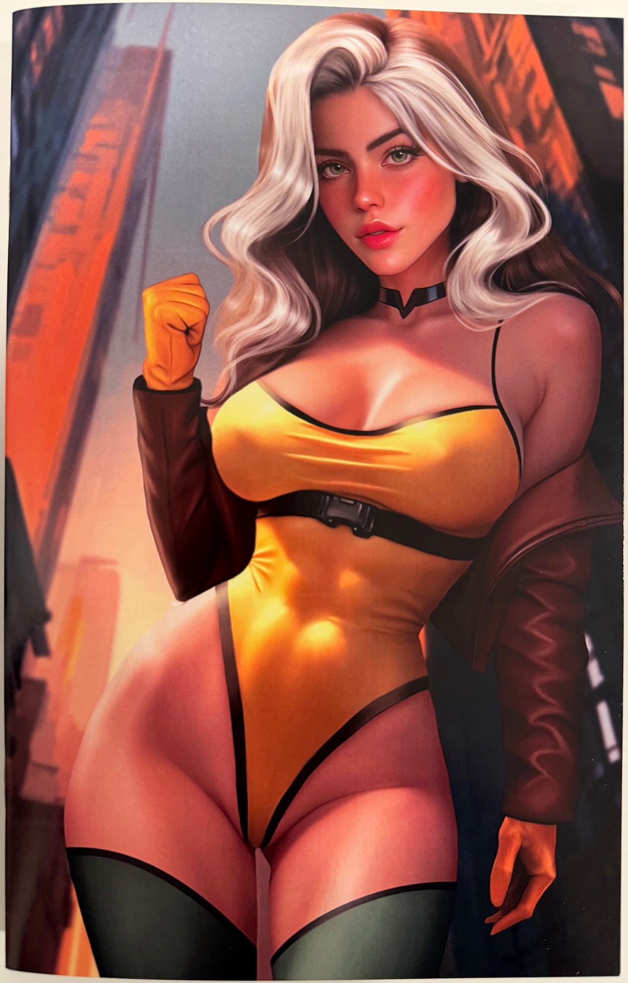 Her golden curves strain against the glossy yellow bodysuit, every lush inch begging to be peeled free as she stands defiant against the city skyline. The black belt cinches her tiny waist before flaring into hips that promise to ruin anyone who dares grip them too hard. With those heavy breasts heaving and silver hair cascading like liquid sin, this Rogue looks ready to steal more than just powers tonight.