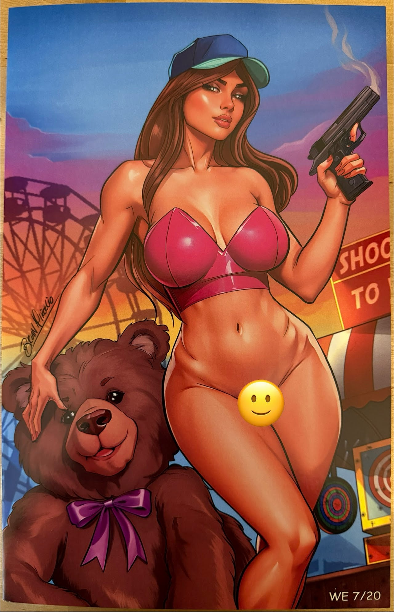 Carnival lights blaze against a cotton-candy sunset as a sultry sharpshooter strolls from the booth, cap tipped low and a smoking pistol still in hand. A glossy pink bustier hugs her curves while a giant prize bear lumbers at her side like a trophy for hitting every bullseye. Sweetness and danger mingle in the air—gunpowder, spun sugar, and a smirk that promises more mischief after dark.